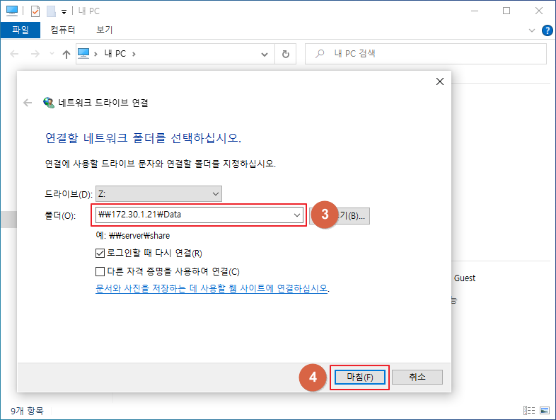 → "내 자격 증명 기억"은 설정 이후 해당 네트워크 드라이브 연결시 추가 로그인없이 접속이 가능하도록 해주는 기능입니다.