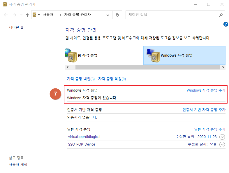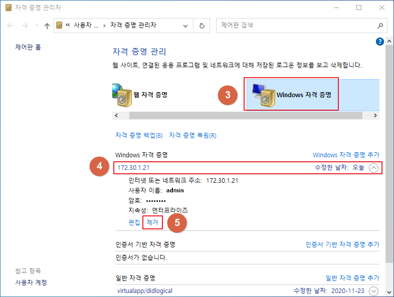 ▷ "윈도우즈 자격증명"에서 기존 로그인 정보를 삭제하는 방법은 아래 내용과 같습니다.