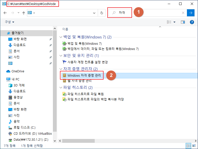 ▷ "갓모드"에서 검색어를 "자격"으로 검색하면 "Windows 자격 증명 관리"가 보이며, 클릭하여 설정화면으로 이동합니다.