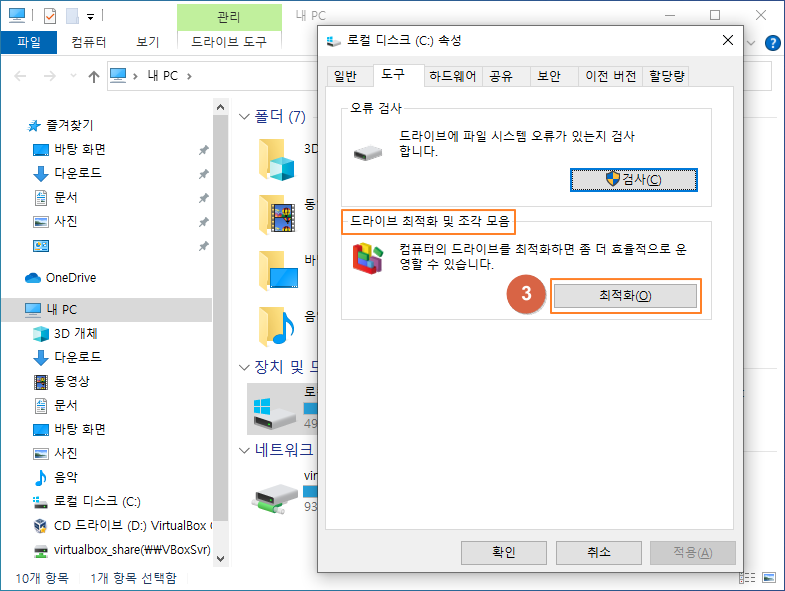 ▷ 단축키 "Ctrl + E"를 입력하여 [파일 탐색기] 실행 후 디스크 조각모음을 하고자 하는 드라이브 선택 후 [속성] - [도구] - [드라이브 최적화 및 조각모음] 에서 "최적화" 버튼을 클릭 합니다.