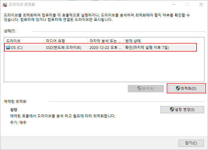 ▷ "드라이브 최적화" 가 실행되며, 조각모음하고자 하는 드라이브 선택 후 "최적화" 메뉴를 클릭하여 조각모음을 실행합니다.