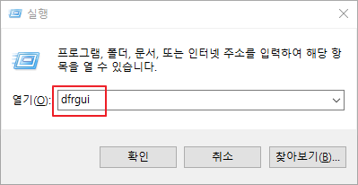 ▷ "윈도우즈키 + R"로 실행 창을 띄운 후 dfrgui 실행 명령어를 입력하면 디스크 조각 모음이 실행됩니다.
