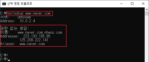 ▷ DNS 설정 후 [명령 프롬프트]를 실행 후 아래 그림과 같이 네이버 URL을 질의하면 캐싱 전용 DNS를 통해 DNS 쿼리가 진행되는 것을 확인할 수 있습니다. 웹으로 접속시 원활하게 접속이 잘 됩니다.