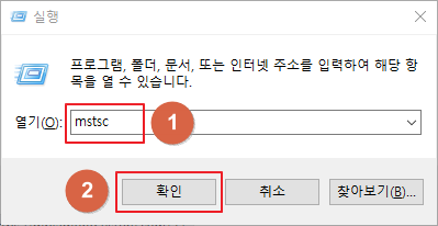 → "윈도우즈키 + R"로 실행창 활성 후 "mstsc" 실행 명령어를 입력하여 "원격 데스크톱 연결"로 이동 합니다.