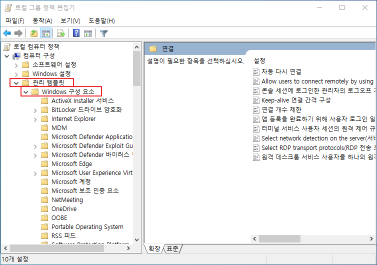 ▷ [로컬 컴퓨터 정책] - [컴퓨터 구성] - [관리 템플릿] - [Windows 구성 요소] - [터미널 서비스] - [원격 데스크톱 세션 호스트] - [연결] 로 이동 합니다.