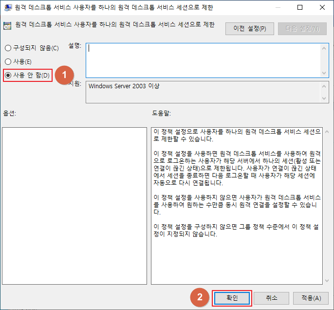 ▷ "원격 데스크톱 서비스 사용자를 하나의 원격 데스크톱 서비스 세션으로 제한"은 여러 사람이 동시에 원격 데스크톱 연결을 사용하게 설정해주는 정책으로 "사용 안 함"을 체크해야 여러 사람이 동시에 사용이 가능합니다.