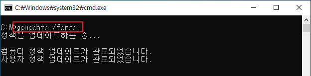 ▷ "원격 데스크톱 연결" 세션 관련 정책 수정 후 윈도우즈 PC를 재시작 또는 아래와 같이 "명령 프롬프트" 창에서 "gpupdate /force" 명령어로 강제 적용을 해야 설정이 적용이 됩니다.