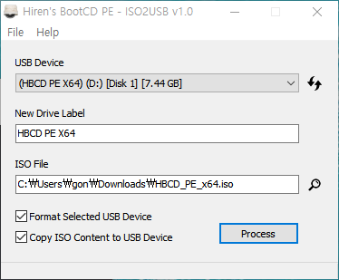 - USB를 PC에 연결 후 ISO2USB.exe 파일 실행 후 아래 그림과 같이 설정 후 "Process" 클릭