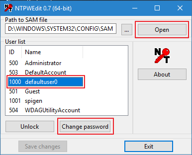 - NT Password Edit 프로그램 실행 후 "Open" - "100 defaultuser0" - "Change password" 순으로 클릭