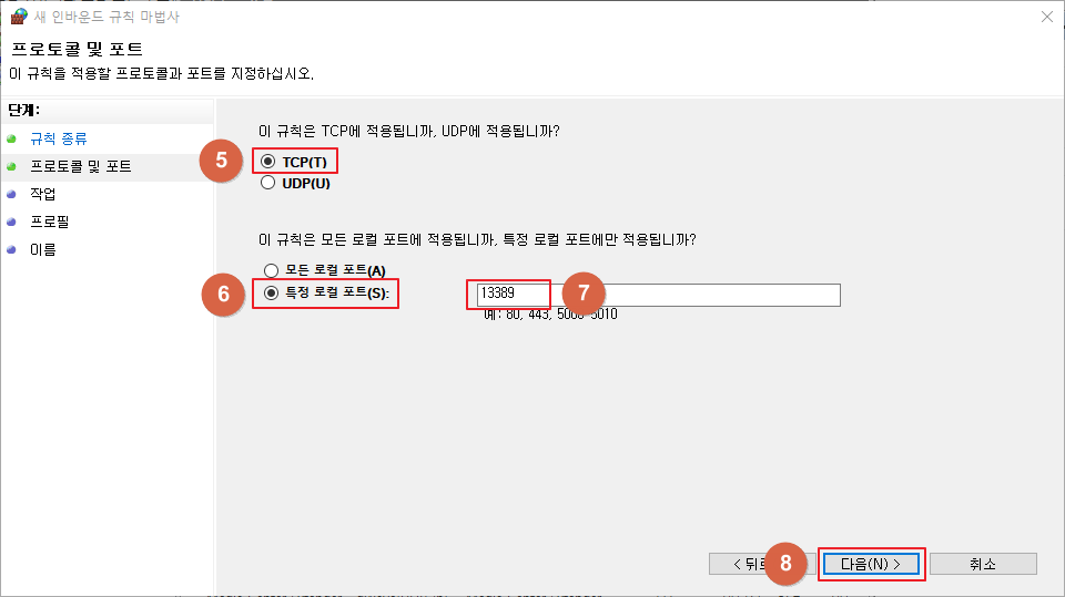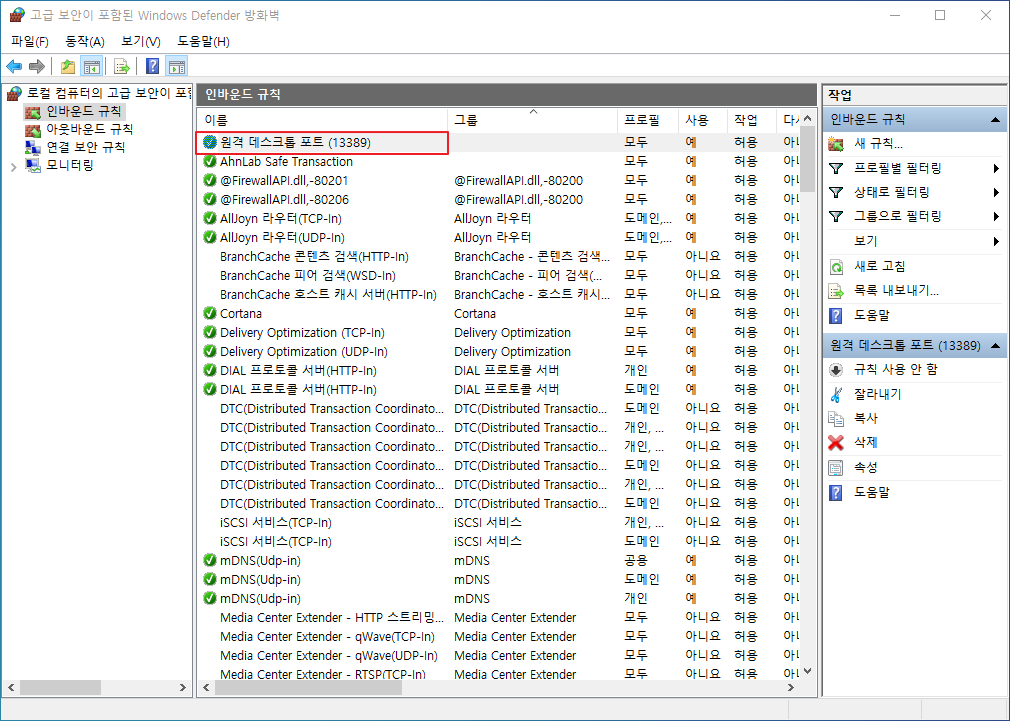 ▷ 아래 그림과 같이 [인바운드 규칙] - [새 규칙]에서 포트 13389를 허용하는 방화벽 정책을 추가 합니다.