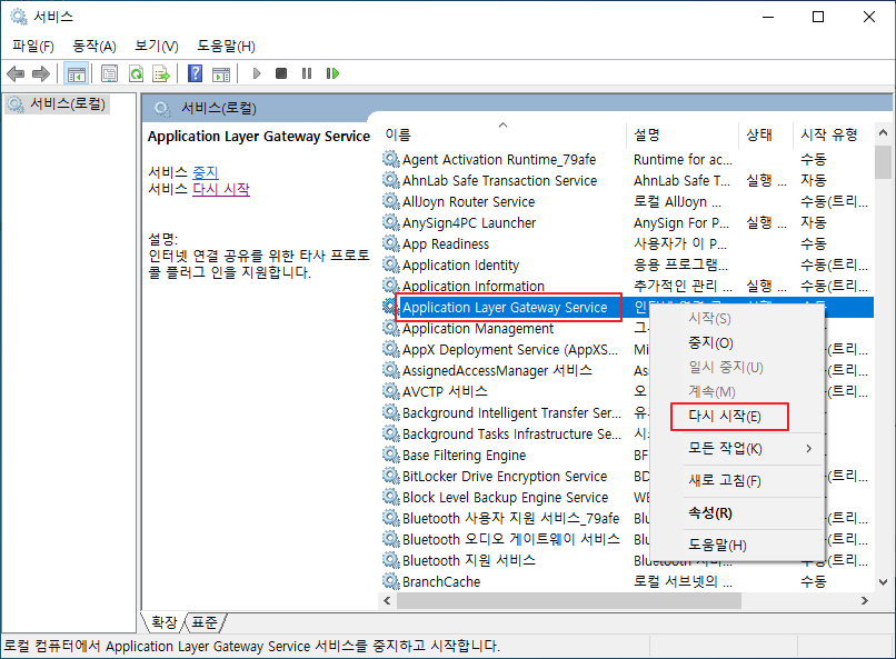 ▷ filezilla server 디렉토리 설정시 “at least one shared directory is not a valid local path” 라는 메시지가 나오며 적용되지 않는 경우가 있는데, 이런 경우는 아래 그림과 같이 "Application Layer Gateway Service"를 실행하면 됩니다.