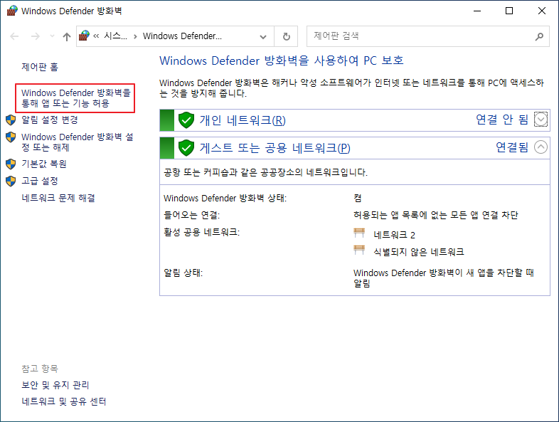 ▷ 윈도우즈10 방화벽 설정에 대해 추가 설명은 이전 포스팅을 참고하기 바랍니다.