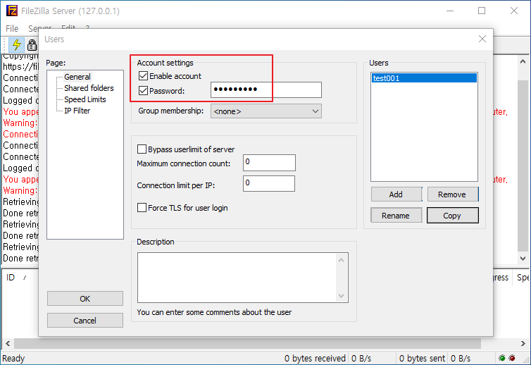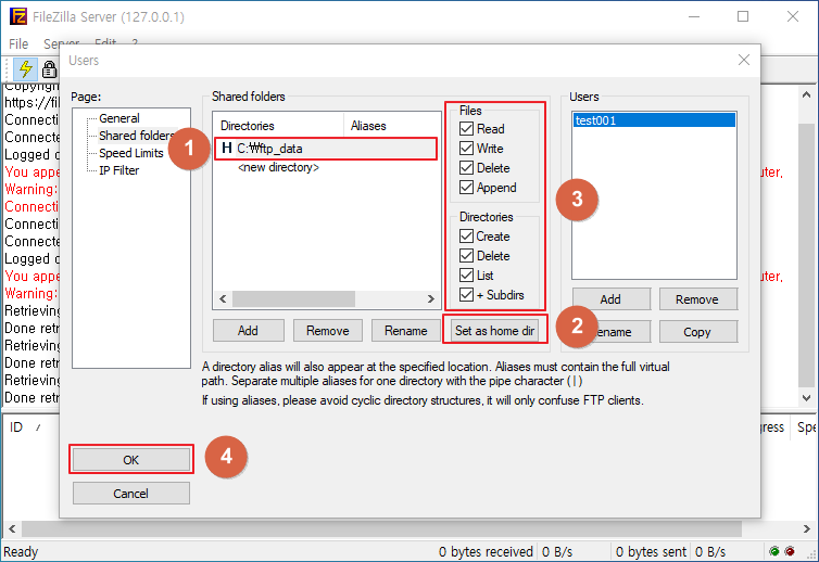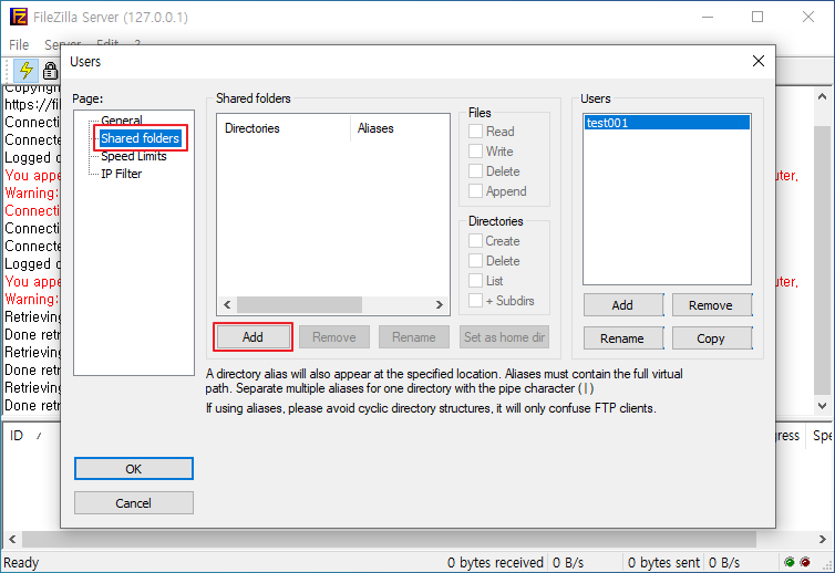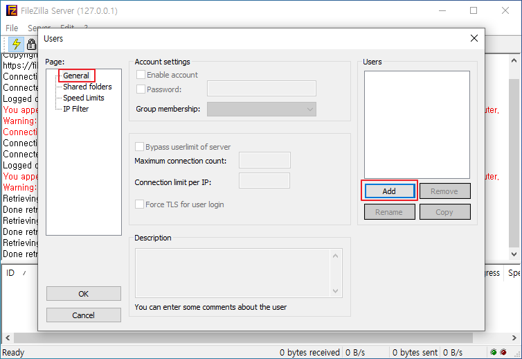 ▷ [General] 옵션에서 "Add" 를 눌러 사용자를 추가 합니다. 사용자 추가 후 [Shared folders]에서 FTP 서비스에 사용할 공유 폴더를 지정 후 사용자의 권한을 부여합니다.