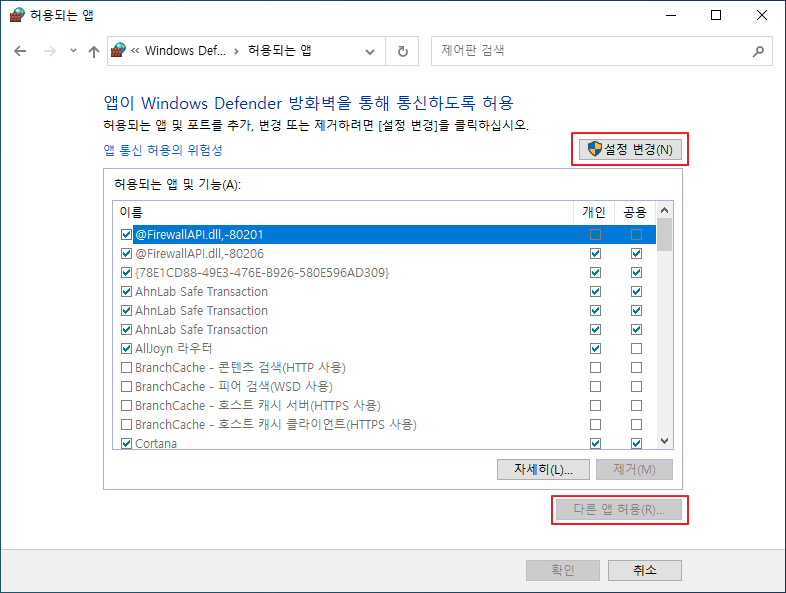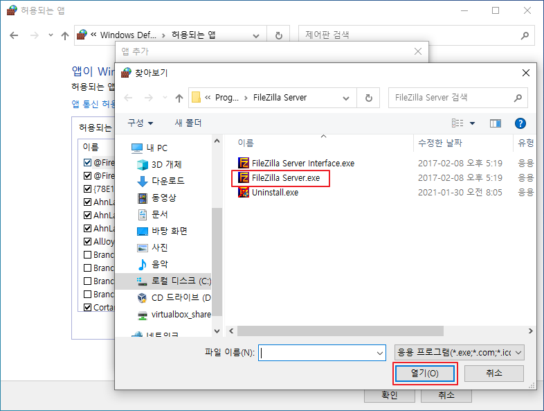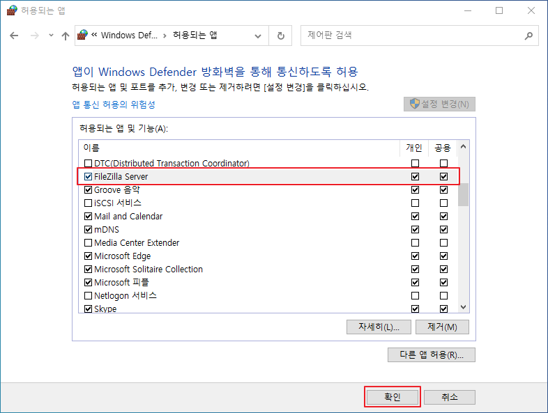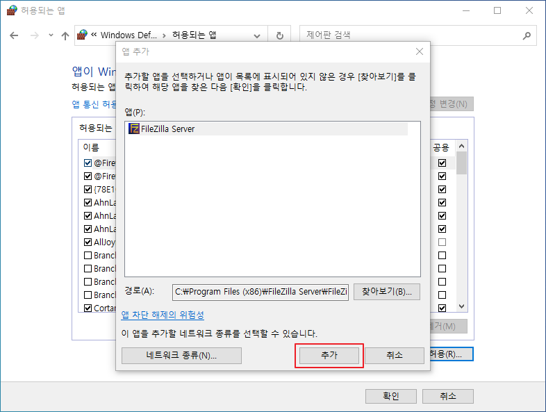 ▷ FTP 서버로 사용자가 접속하기 위해서는 FTP 서버로 사용 중인 윈도우즈10의 방화벽에서 파일질라 FTP 서비스를 허용해야 합니다. 설정 방법은 아래와 같이 진행합니다.