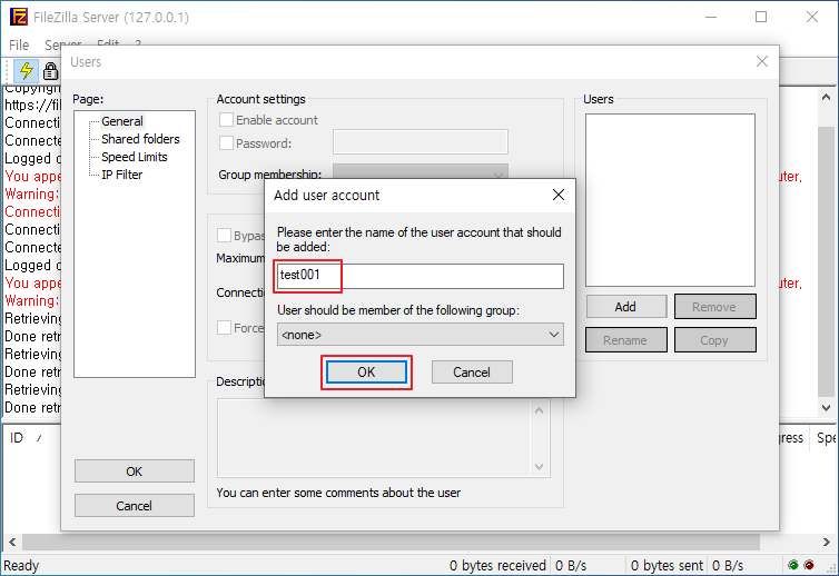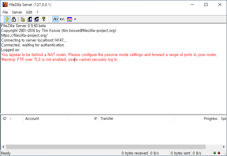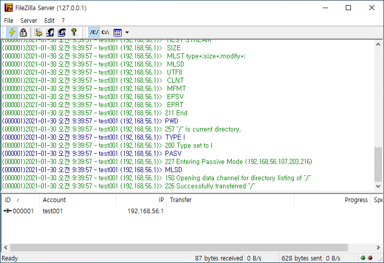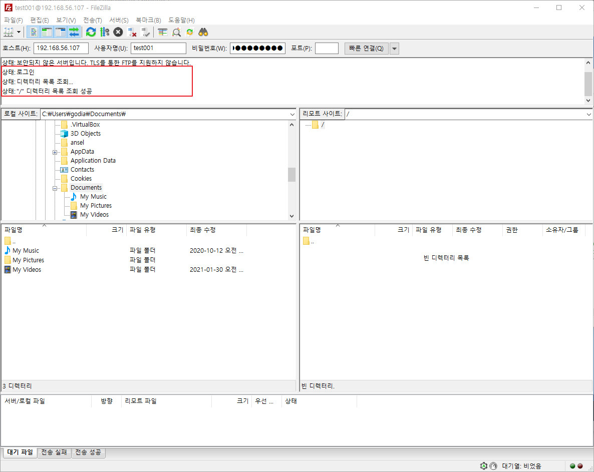 ▷ 파일질라 클라이언트로 새로 생성한 파일질라 FTP 서버를 아래 그림과 같이 접속 합니다. 클라이언트와 서버 모두 접속 성공한 메시지를 확인할 수 있습니다.