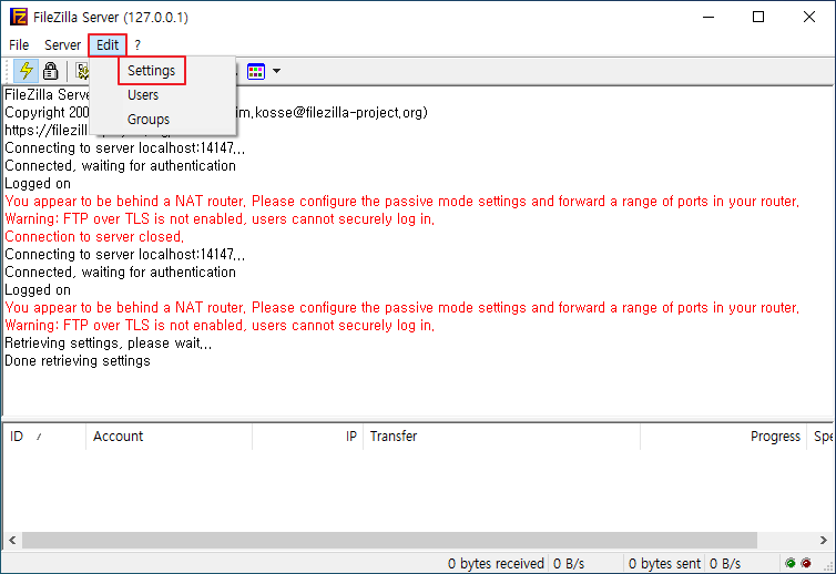 ▷ FTP 서버 설정은 아래와 같이 [Edit] - [Settings] 에서 설정이 가능합니다.