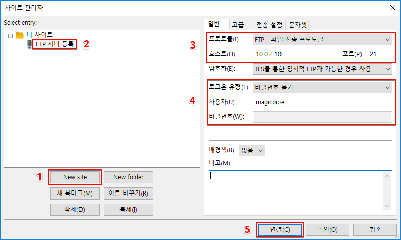 "사이트 관리자" 등록 후 이용 방법은 아래 그림과 같이 순서대로 클릭하여 사용이 가능합니다. 보안상의 이유로 파일질라 내에 패스워드를 저장하지 않기 때문에 비밀번호를 입력 후 접속이 됩니다.