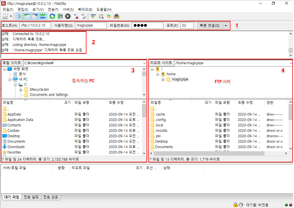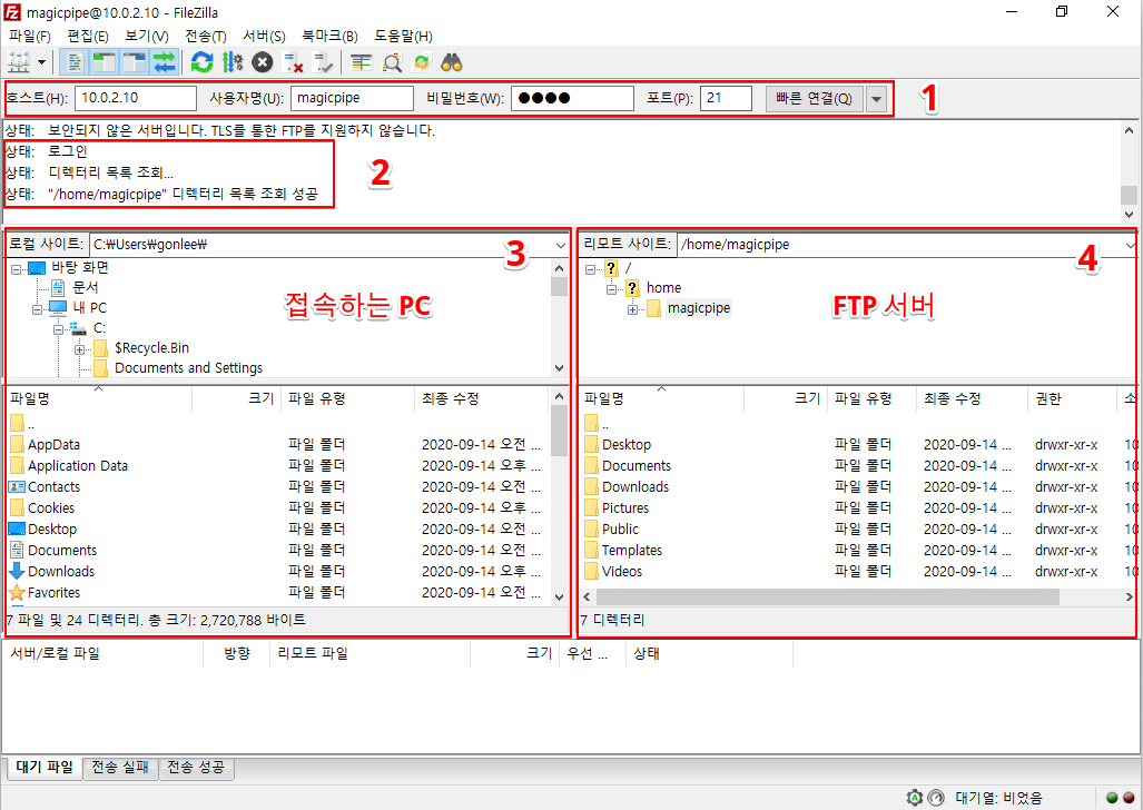 아래 그림에서 1번 항목과 같이 FTP 접속 정보를 입력 후 "빠른 연결" 버튼을 클릭하면 2번 항목과 같이 접속이 됩니다.