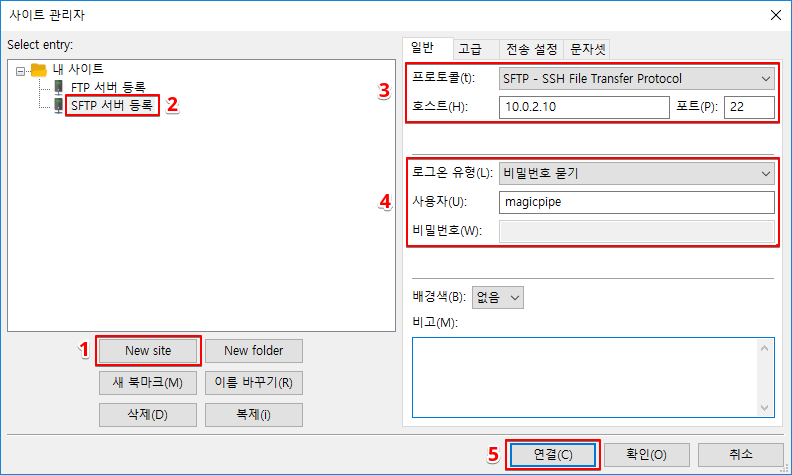 * 포트 : SFTP 기본 포트인 22 입력 (FTP 서버 설정에 따라 포트가 다를 수 있음)