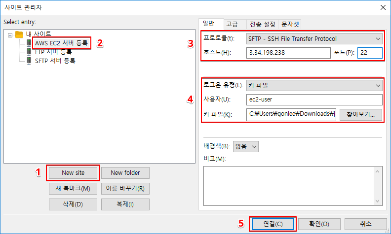 여기서 주의해야할 부분은 4번의 "로그온 유형"을 "키 파일"로 선택 후 "키 파일"을 EC2 인증서로 업로드해야 인증서 로그인이 가능합니다.