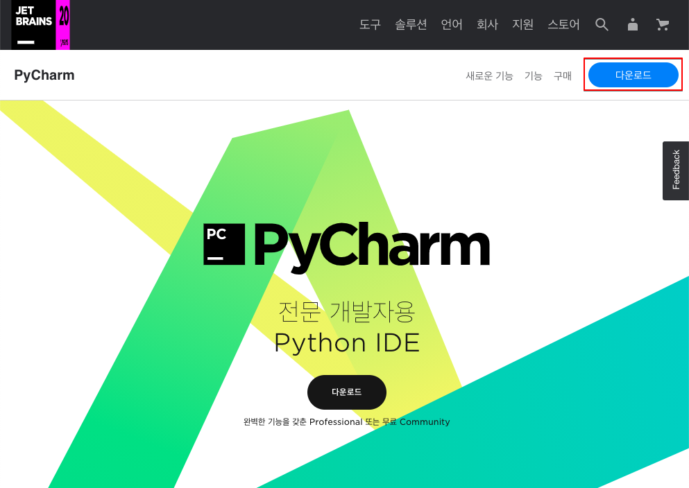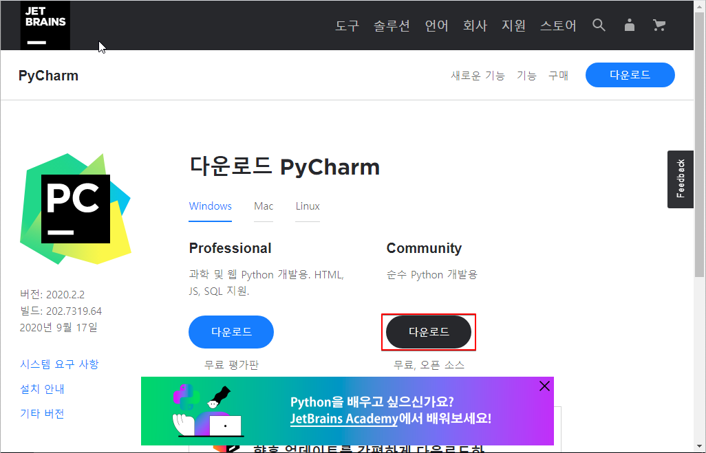 ▷ 파이참 다운로드 사이트(링크)로 접속하여 설치 파일을 다운로드 합니다. 다운로드 시 무료버전인 Community 버전을 다운로드 합니다.