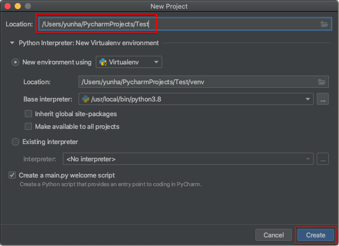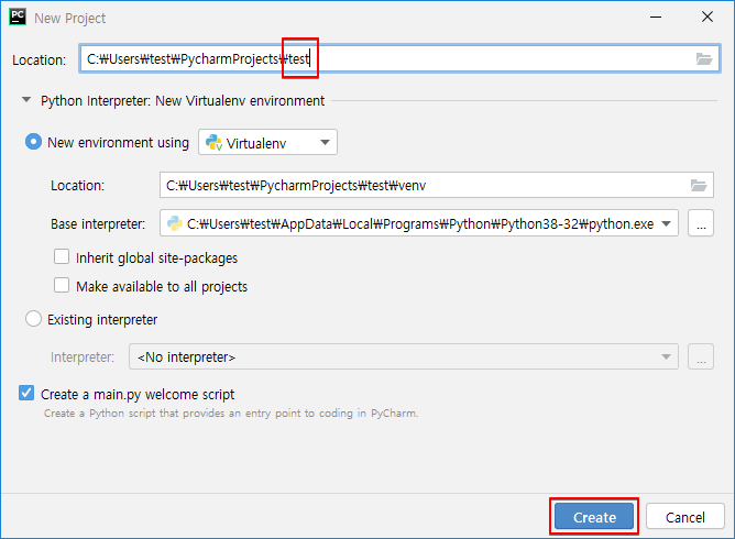 ▷ 위의 그림에서 "New Project"를 선택하여 신규 프로젝트를 아래 그림과 같이 생성합니다. 프로젝트 이름은 편하게 지정하여 사용하면 됩니다. (필자는 예시로 test로 지정함)