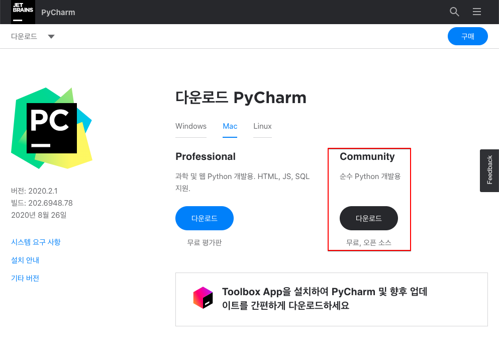 파이참은 유료 버전과 무료 버전 등 총 2가지 버전이 존재합니다. 본 포스팅에서는 무료 버전인 Community 버전을 윈도우즈10, MacOS 환경에서 파이참을 설치하는 방법에 대해 소개하고자 합니다.
