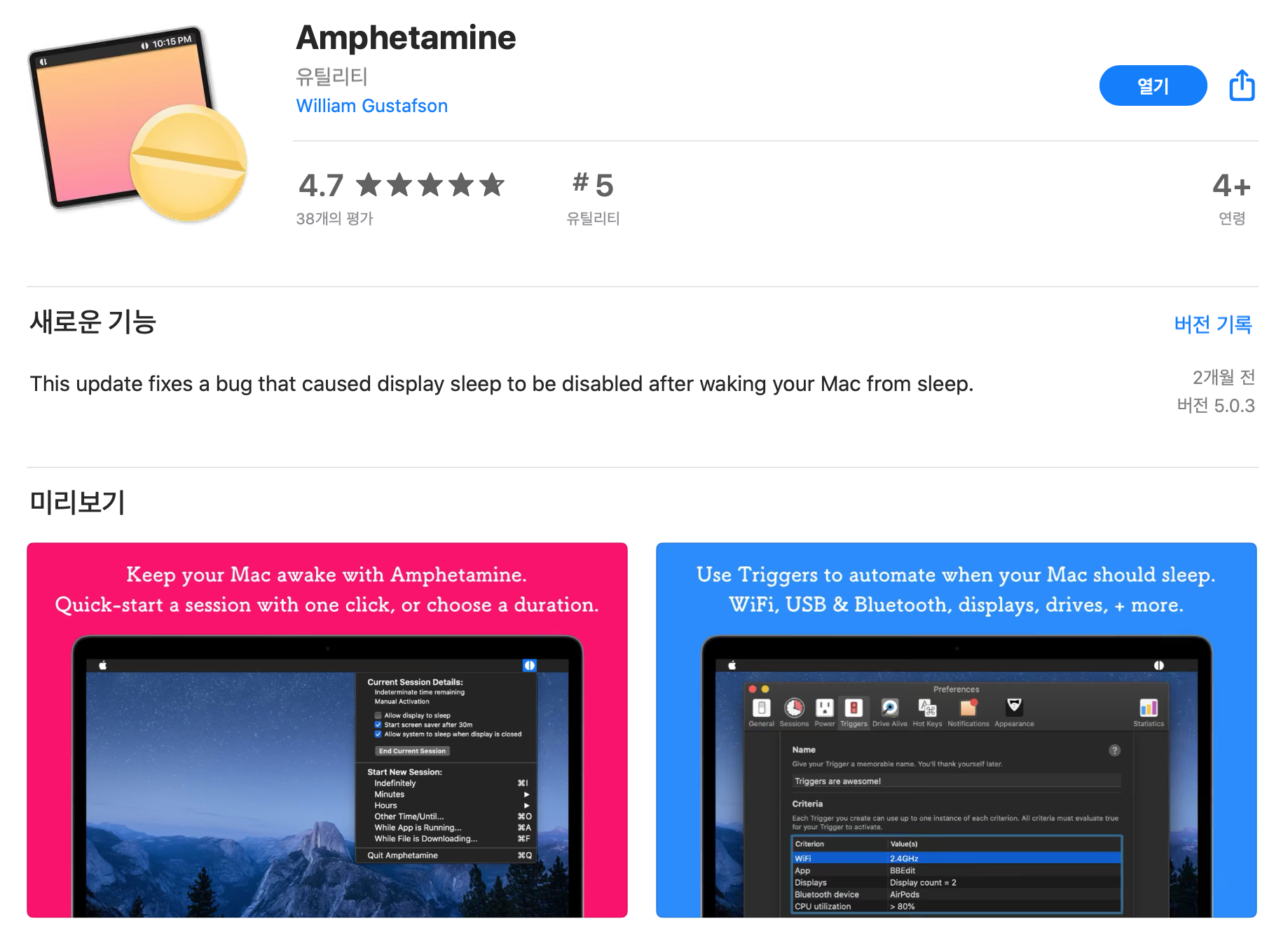 ▷ 설치 방법은 앱스토어에서 "amphetamine"으로 검색하여 "받기" 버튼을 누르면 간편하게 설치가 됩니다.