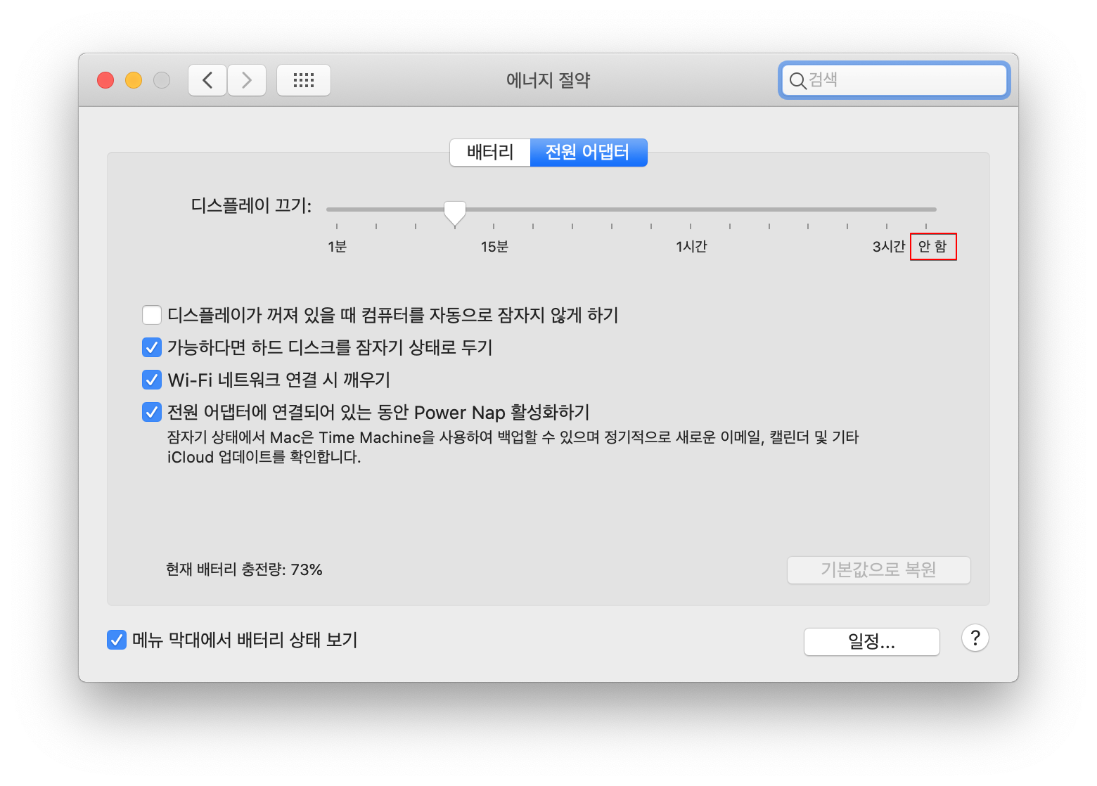 ▷ 해당 화면에서 "디스플레이 끄기"를 "안함"으로 설정하면 맥PC 장기 미사용시 화면 잠금이 되지 않습니다.
