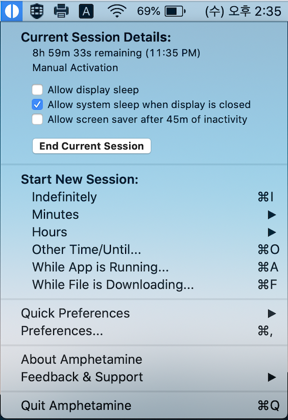 → Amphetamine 어플을 실행하면 화면 오른쪽 상단에 작은 아이콘이 있는데요. Amphetamine 아이콘을 클릭하면 아래와 같은 메뉴가 보입니다.