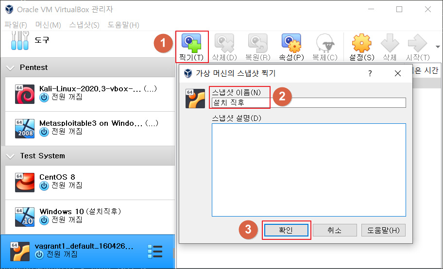 ▷ 네트워크 설정이 완료되었다면, 시스템을 종료하고 스냅샷을 생성 후 설치를 종료 합니다.