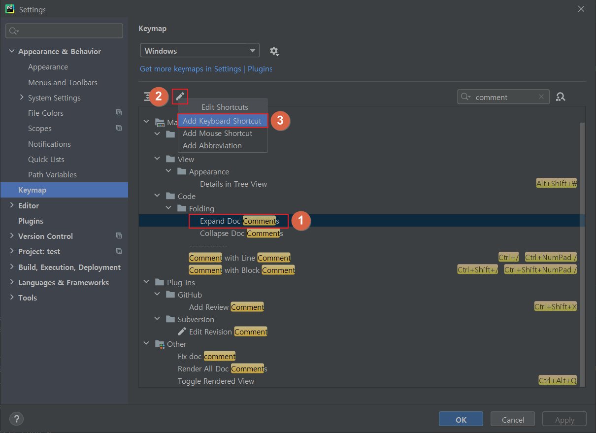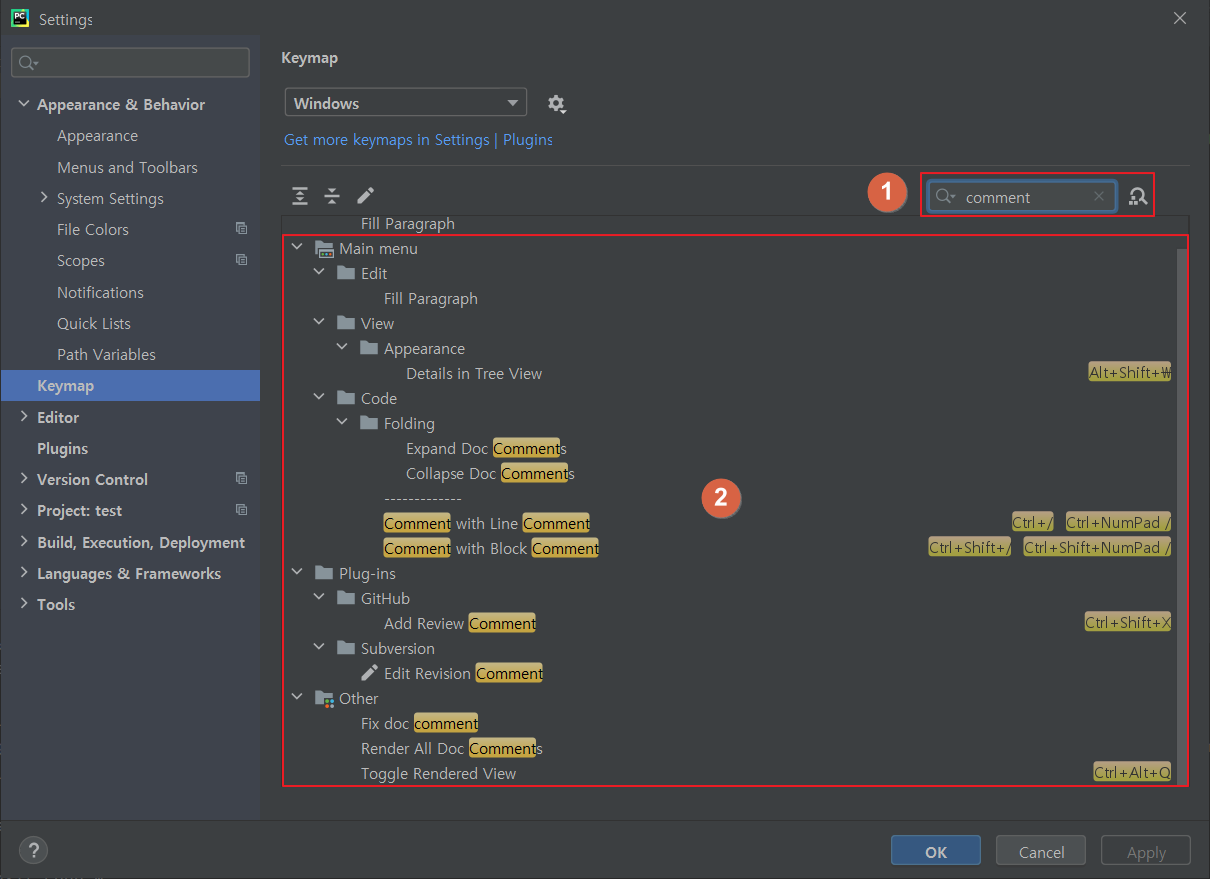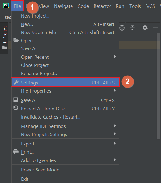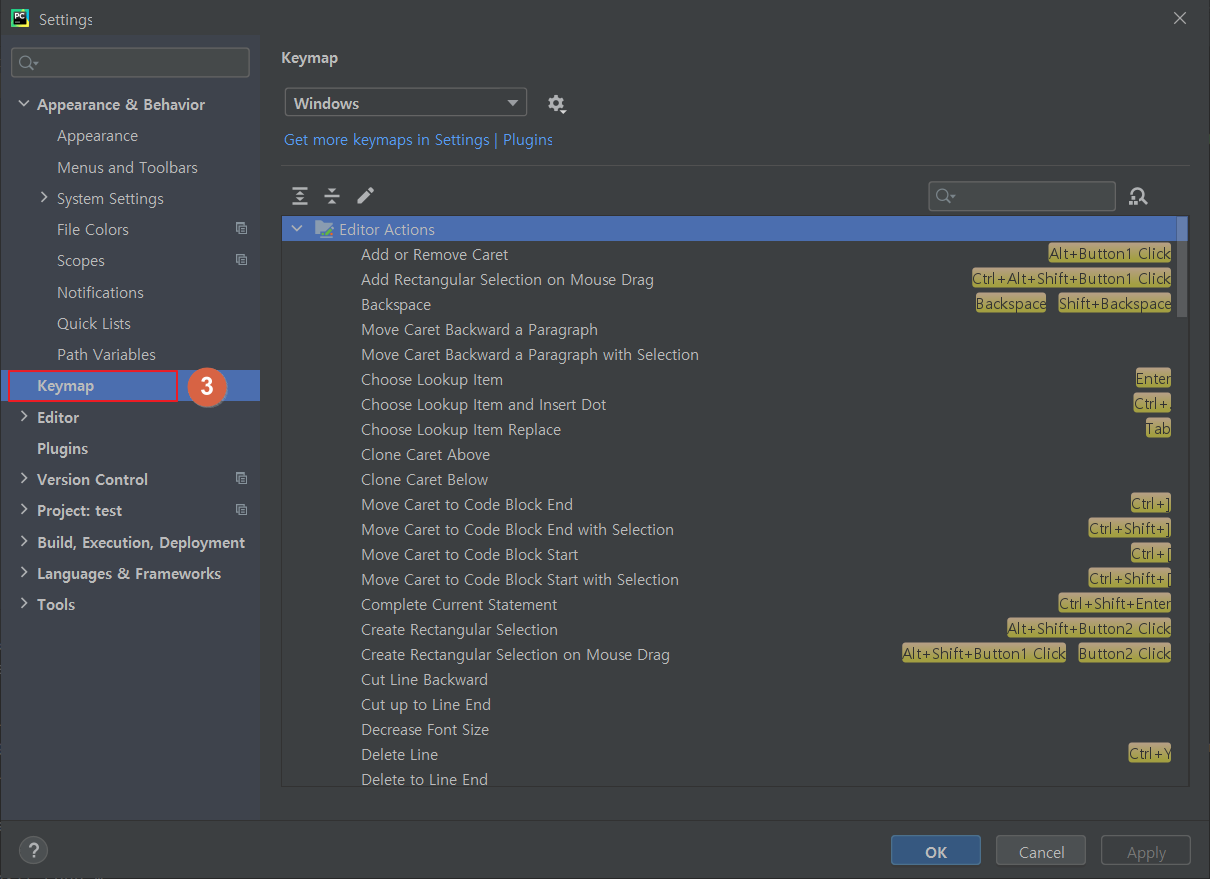 ▷ 파이참 메뉴 [File] - [Settings...] 를 선택하면 환경설정 팝업 창이 나오고 [Keymap]을 선택하면 등록된 단축키 설정 모음 확인이 가능합니다.