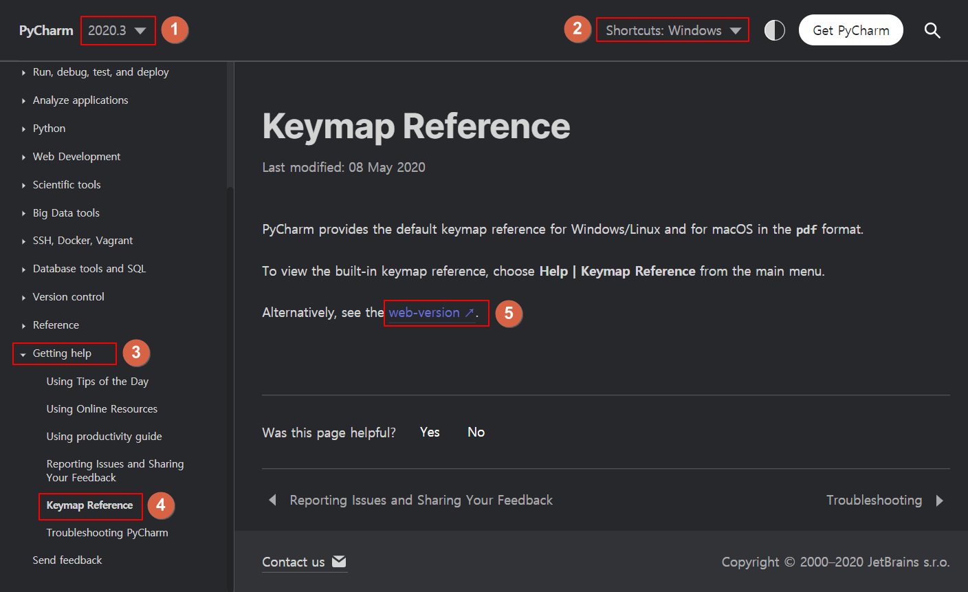▷ 파이참 개발社인 jetbrains은 파이참 사용법에 대해 제공하고 있는데요. 그 중 가장 많이 이용하는 단축키 모음에 대해 "파이참 키맵 레퍼런스"라는 이름으로 아래 링크를 통해 OS 별, 파이참 버전 별로 제공하고 있습니다.