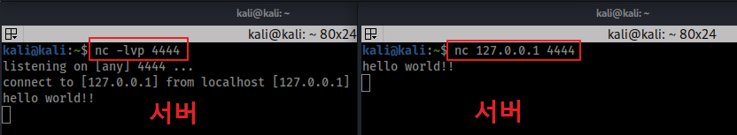 # 클라이언트 : 서버 포트 4444로 접속 후 아무 키 입력