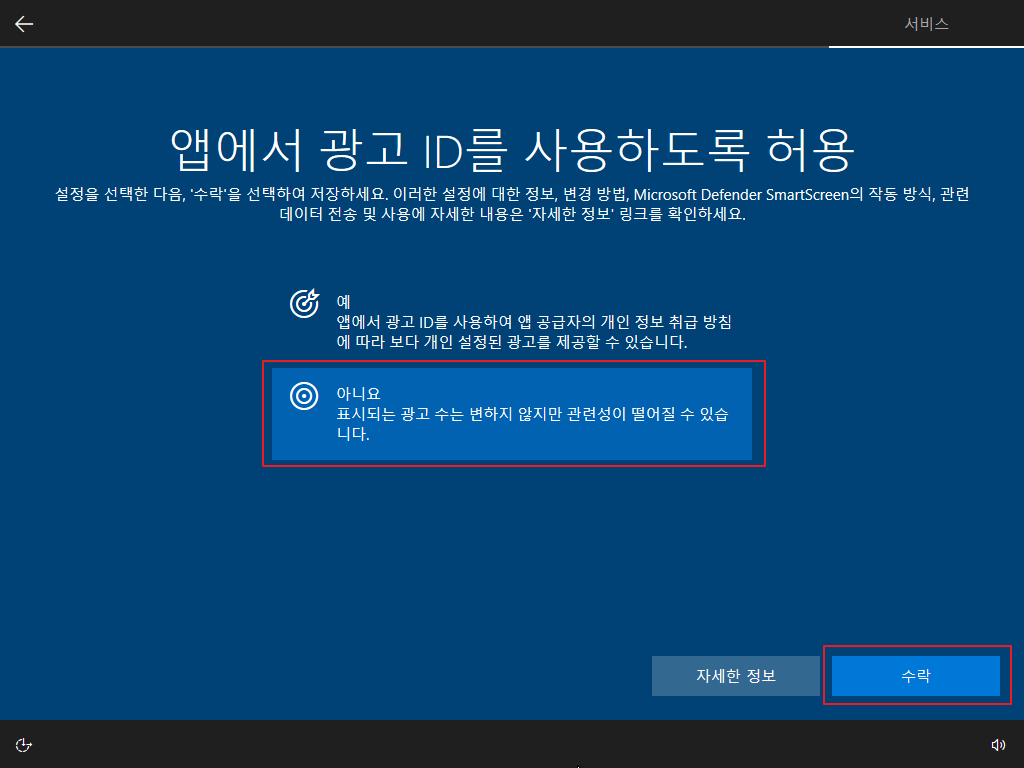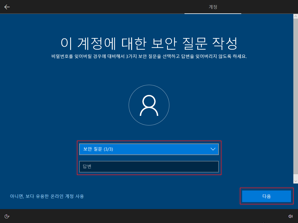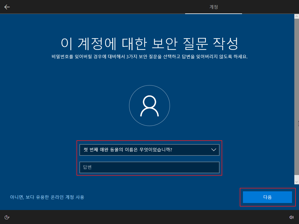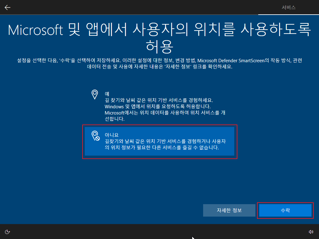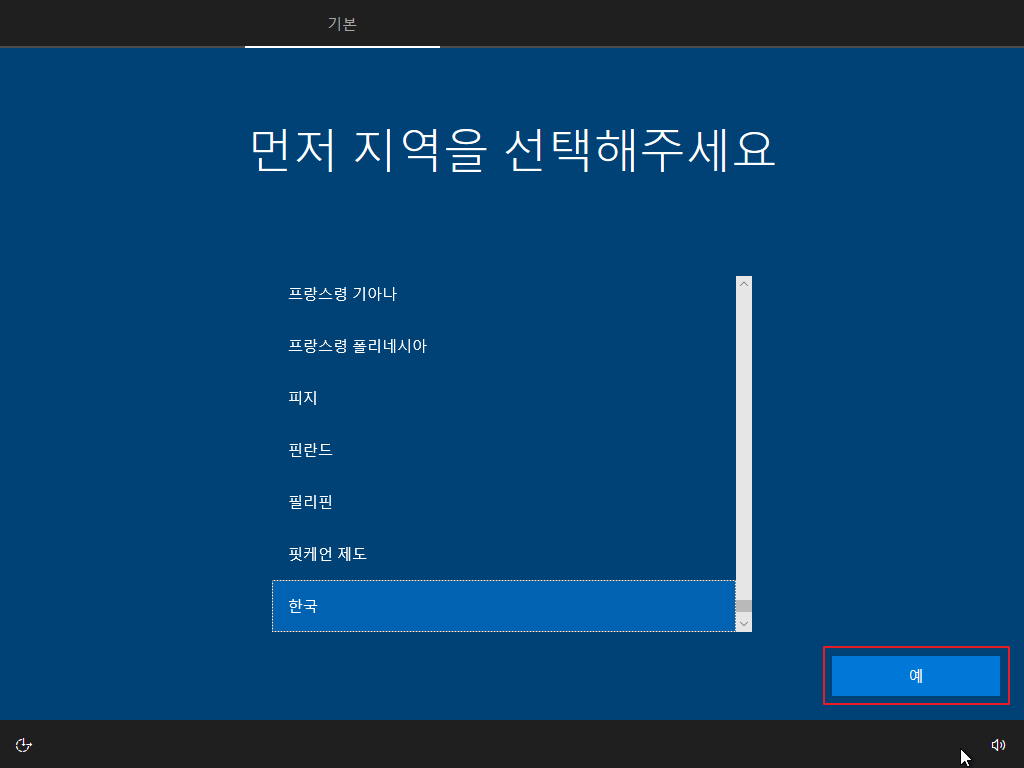▷ 재부팅 후 Windows 10 사용자 설정이 나오며, 아래와 같이 설정을 하면 됩니다. (사용자 설정은 개인 사용 환경에 대한 설정이므로 본 포스팅의 내용을 참고하여 사용자 환경에 맞게 설정하기 바랍니다.)