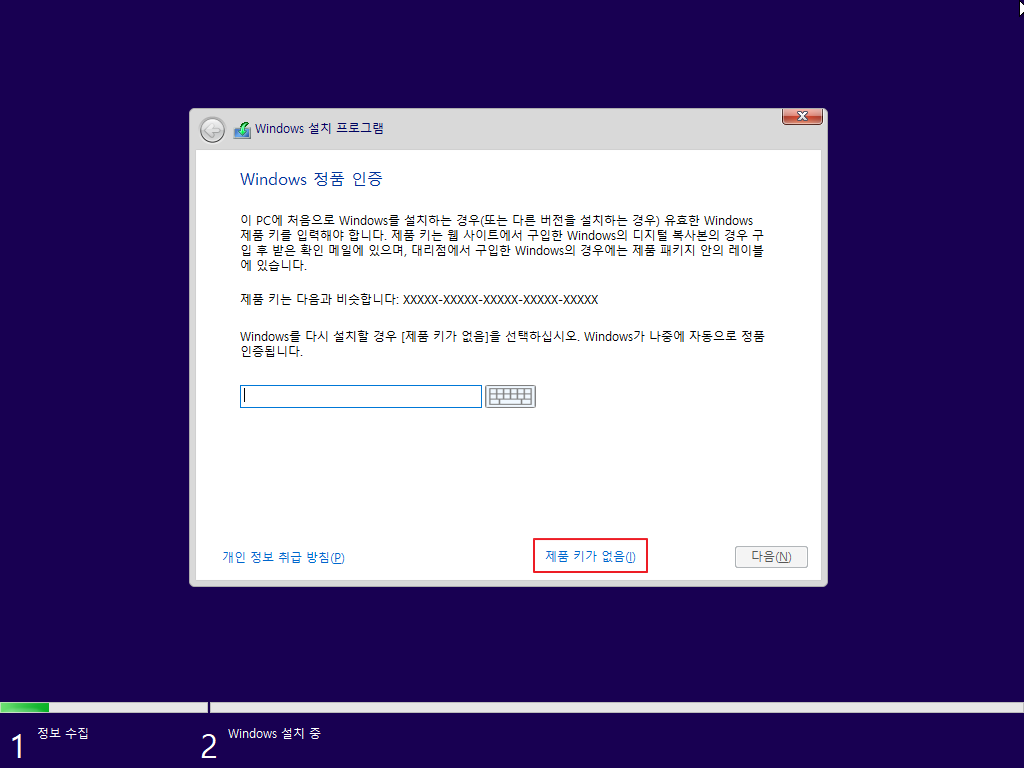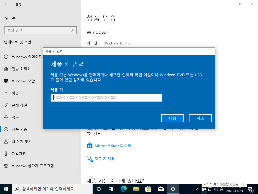 ▷ Windows 업데이트 완료 후 Windows OS 라이선스를 아래와 같이 입력 후 정품 인증을 받습니다.