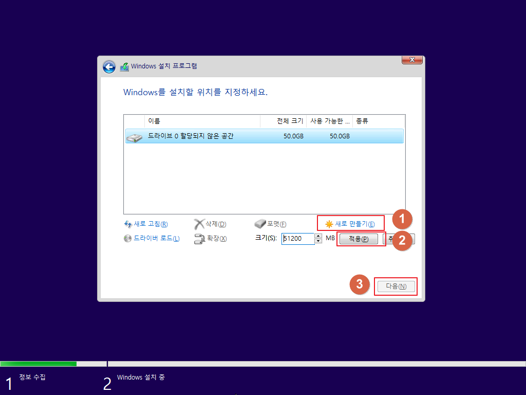 → Windows 10 설치를 할 디스크 공간을 포맷하고 설정하는 내용입니다. 새로 설치 또는 기존 데이터를 삭제하고자할 때 아래와 같이 설정을 합니다.