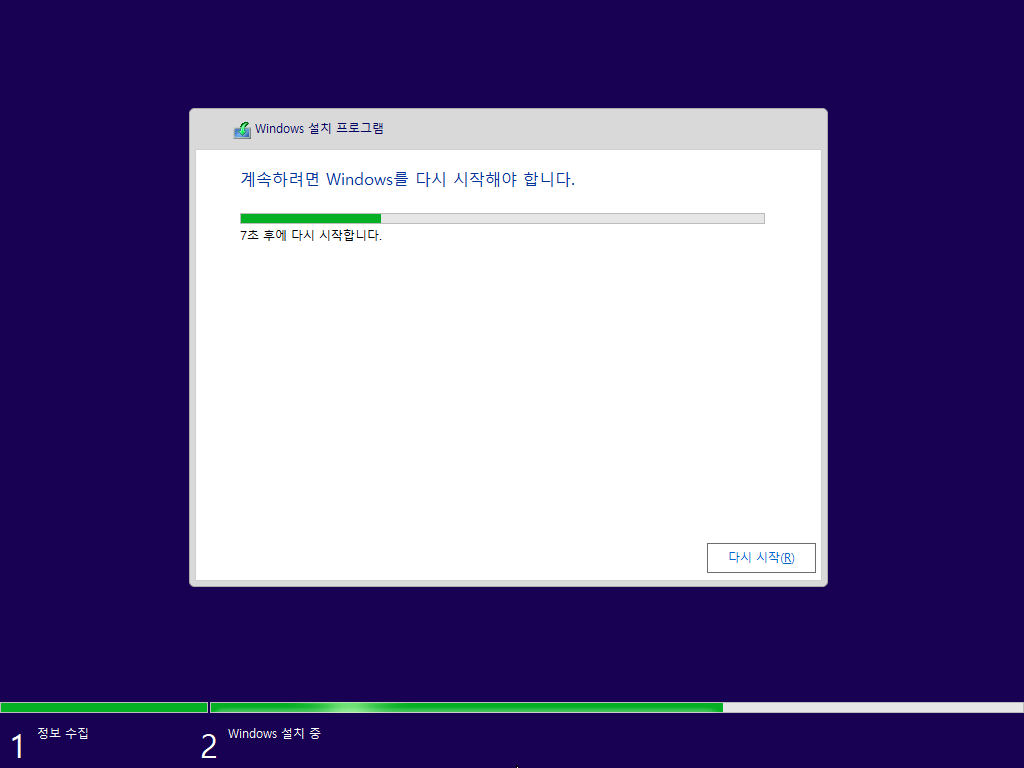 → 설치 완료 후 재부팅을 합니다. 이때 Windows 10 설치 USB를 PC에서 제거 합니다.