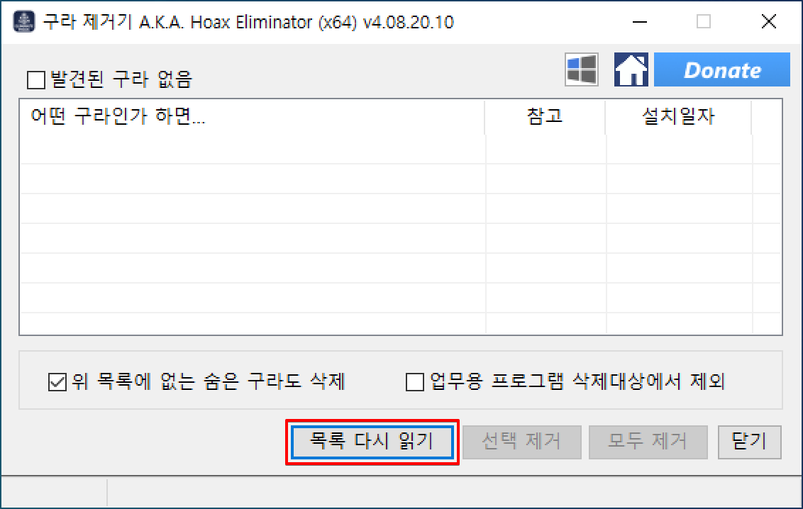▷ 보안 프로그램이 모두 삭제가 되었으면 아래 그림과 같이 "목록 다시 읽기" 버튼을 눌러 혹시 삭제되지 않았거나 아직 삭제하지 않은 보안 프로그램이 존재하는지 다시 확인하면 됩니다.