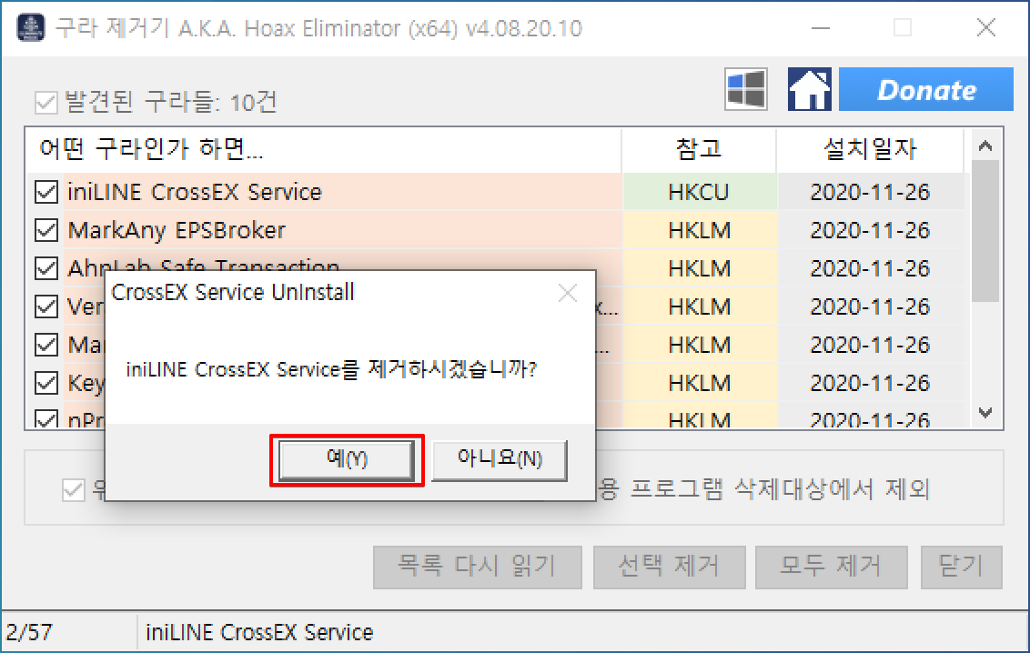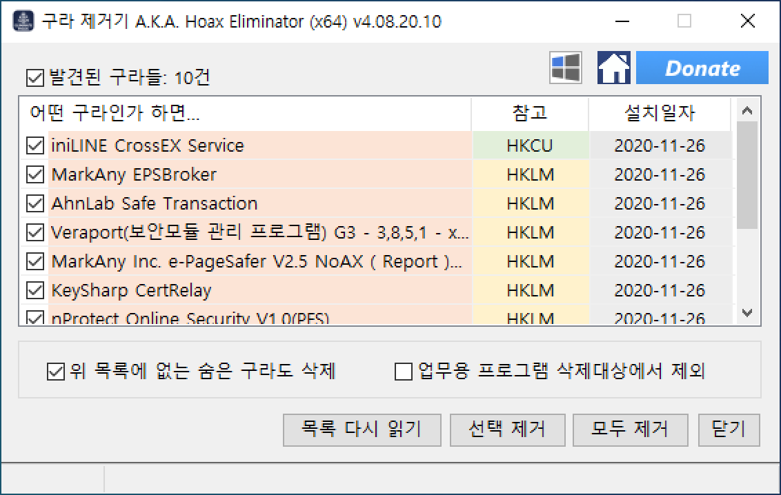 ▷ 압축 해제후 구라제거기 실행 파일이 있으며, 별도 설치를 하지 않고 실행 파일을 실행하여 사용이 가능합니다. 구라제거기를 실행하면 PC에 설치된 온라인 뱅킹 또는 공공기관에서 설치한 보안 프로그램 목록을 아래 그림과 같이 자동으로 읽어옵니다.