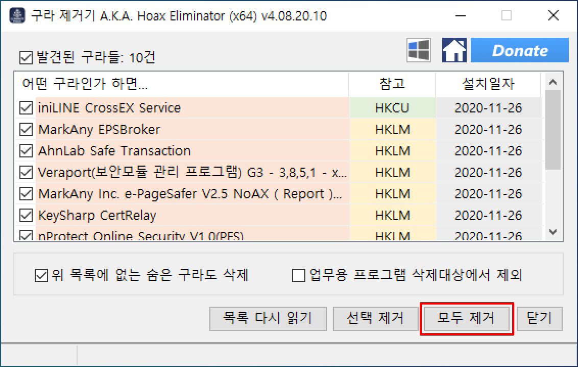 ▷ 구라제거기를 이용하여 삭제하는 대상이 온라인 뱅킹 또는 공공기관에서 제공하는 보안 프로그램을 조금더 쉽고 빠르게 삭제하는 것에 목적이 있습니다. 어쩌다 한번 온라인 뱅킹이나 공공기관을 이용하는데 PC에 설치된 다양한 보안 프로그램이 백그라운드로 실행되어 PC 리소스를 사용하는 것을 방지하기 위해 일괄 삭제를 하는 것이 PC 자원을 효율적으로 사용하는데 좋기 때문에 삭제하는 방법을 소개드린 것입니다.