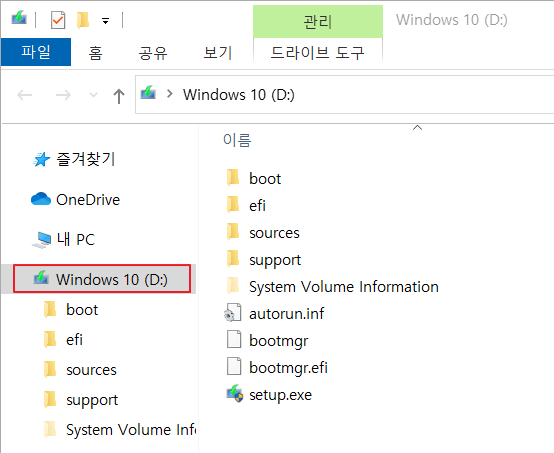 ▷ 이렇게 생성한 USB 메모리를 Windows 10 OS에 연결하면 아래 그림과 같이 인식이 되고, 파일의 읽고 쓰기가 가능합니다.