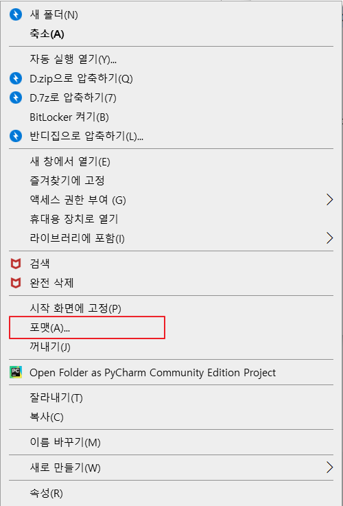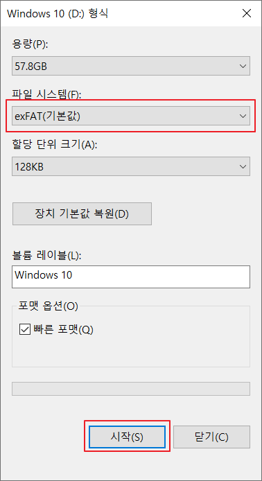 ▷ 이전 포스팅에서 만들었던 "Windows 10 USB 부팅 USB"를 exFAT 파일 시스템으로 구성하여 만능 USB로 구성해보겠습니다. 해당 USB를 선택 후 마우스 우클릭하여 "포맷" 메뉴 선택 후 파일시스템을 "exFAT"로 설정 후 "시작" 버튼을 눌러 포맷을 진행합니다.