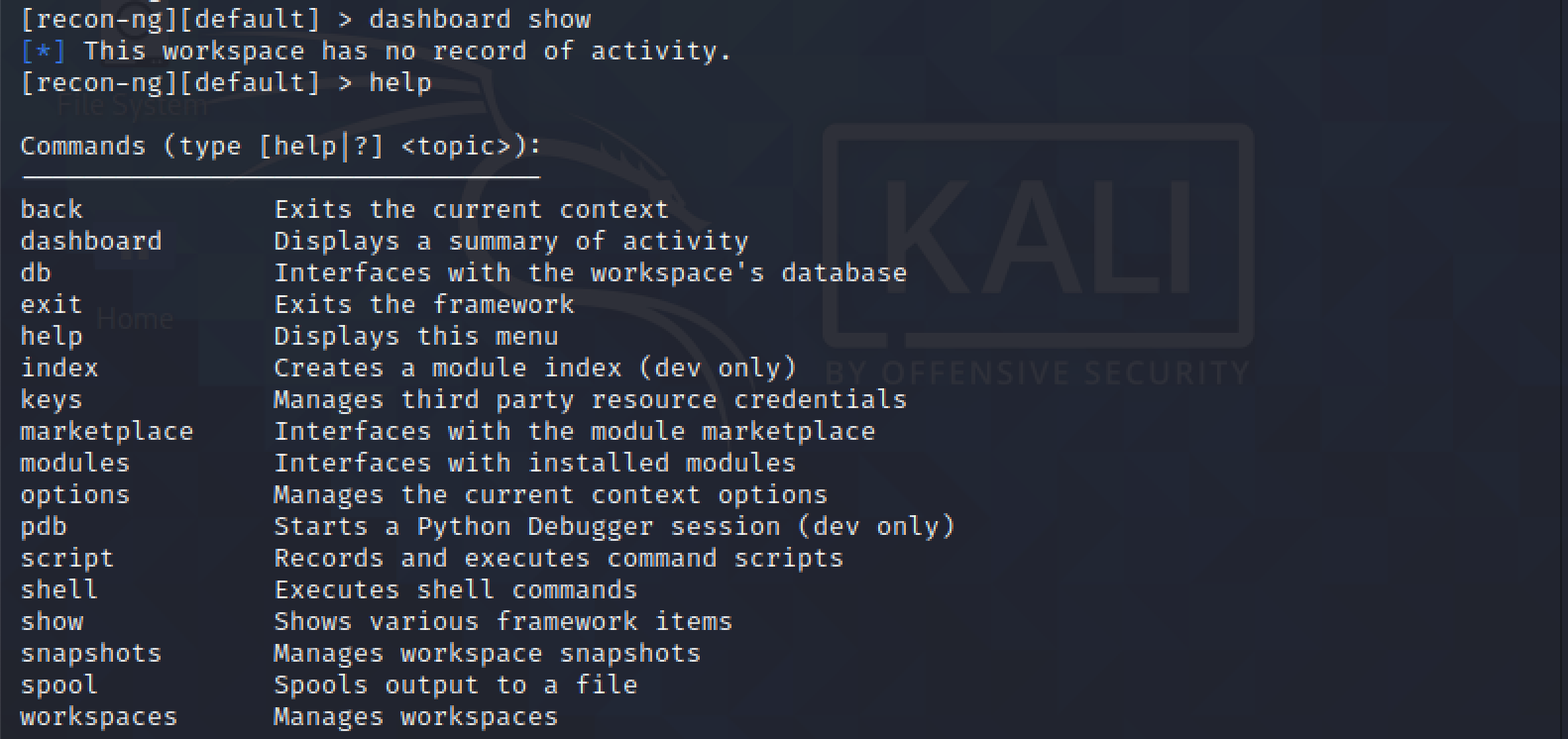 ▷ recon-ng 도움말은 아래 명령어를 통해 확인이 가능합니다.