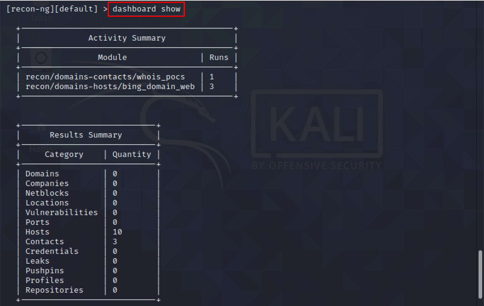 ▷ recon-ng 에서 모듈 사용 현황을 제공해주는데, 아래의 명령어를 사용하여 확인이 가능합니다.