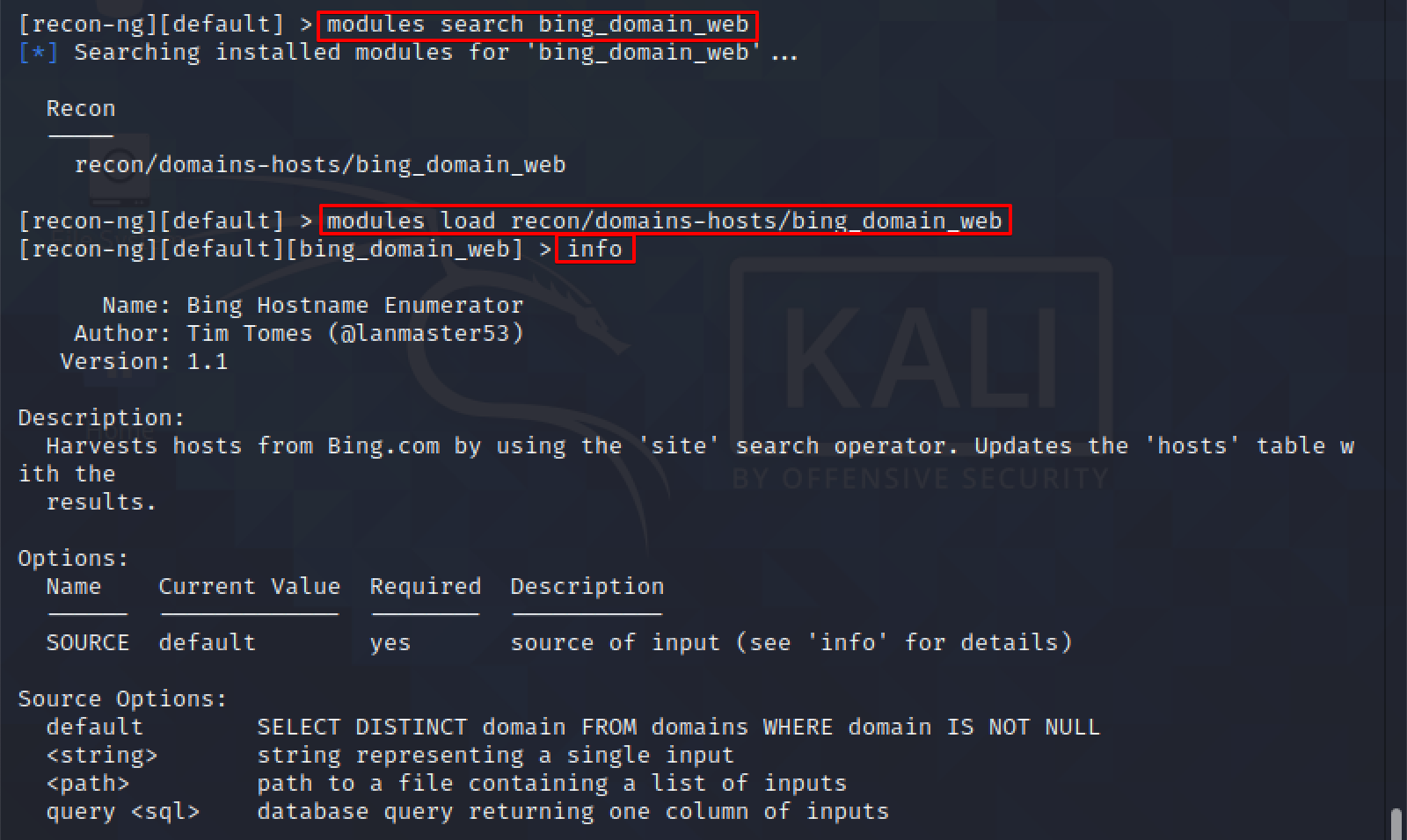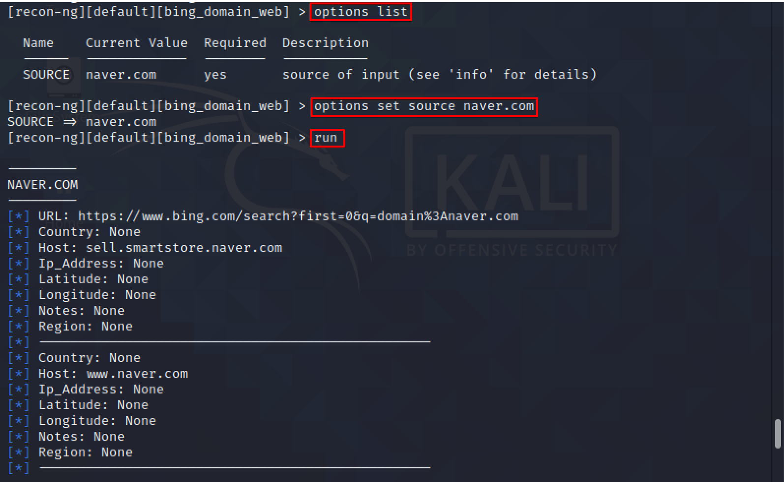→ 명령어 2 : modules load recon/domains-hosts/bing_domain_web