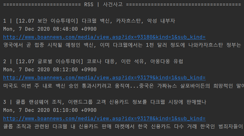 이번 포스팅은 보안뉴스(www.boannews.com)에서 제공하는 RSS를 이용하여 원하는 기간의 뉴스를 자동으로 수집하고 가공하는 내용에 대해 소개하고자 합니다. 파이썬 모듈인 Feedparser 를 이용하여 자동 수집과 가공하는 방법에 대해 궁금하신 분은 아래 포스팅을 참고하여 활용하였으면 합니다.