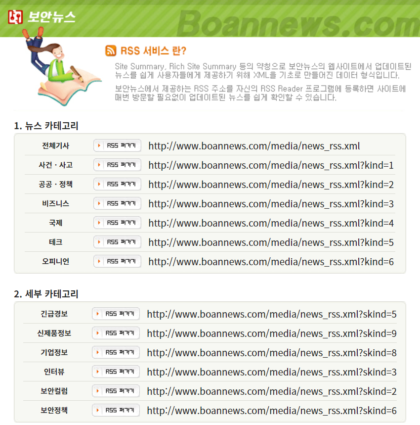 ▷ 보안뉴스(www.boannews.com)는 정보보안 관련 다양한 소식을 제공하는 언론사 중 하나 입니다. 해당 언론사 역시 RSS를 제공하고 있습니다.